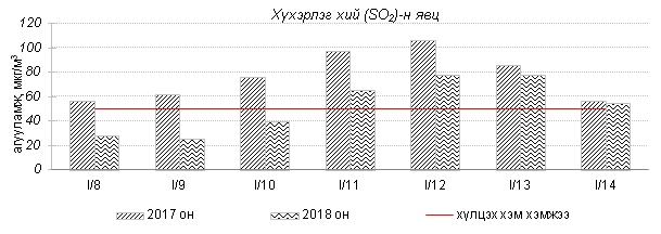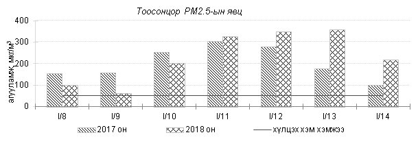 Өнгөрсөн 7 хоногийн агаарын чанарын хяналт шинжилгээний дүнгээр агаарын бохирдол 7 хоногийн сүүлээр илүү ажиглагдаж Улаанбаатар хотын гэр хороолол орчим “Их” болон “Маш их” бохирдолтой түвшинд хүрч 2017 оны мөн үетэй харьцуулахад агаар дахь PM2.5, PM10 тоосонцрын агууламж 12-14%-иар их, хүхэрлэг хийн агууламж 31%-иар бага байна. PM2.5, PM10 тоосонцор, хүхэрлэг хийн 24 цагийн дундаж агууламжийн хамгийн их нь агаарын чанарын стандартаас 4-14 дахин их байна. Дэлгэрэнгүй мэдээг хавсралтаас үзнэ үү.