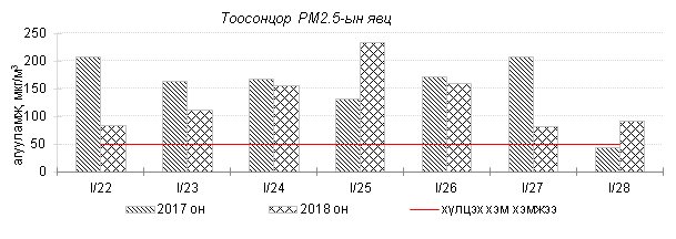 Өнгөрсөн 7 хоногт Улаанбаатар хотын агаарын чанар гэр хороолол орчим “Дунд” болон “Маш их” бохирдолтой бусад бүсүүдэд “Бага” зэргийн бохирдолтой байна. Агаар дахь хүхэрлэг хий SO2, PM2.5 болон PM10 тоосонцрын агууламжийг 2017 оны мөн үетэй харьцуулахад 5-48%-иар бага байна. Агаар бохирдуулах бодисуудын 24 цагийн дундаж агууламжийн хамгийн их нь Агаарын чанарын стандартаас 3.3-6.8 дахин их байна. элгэрэнгүй мэдээг хавсралтаас үзнэ үү.