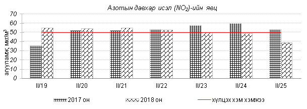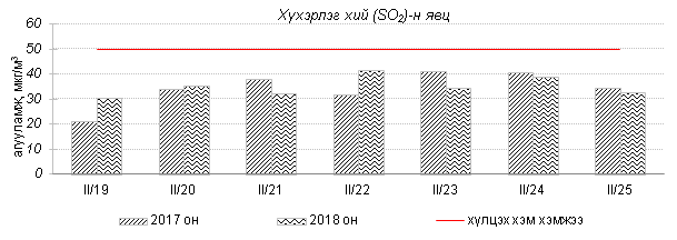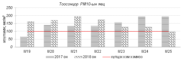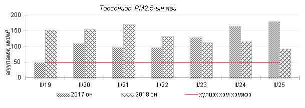 Өнгөрсөн 7 хоногийн агаарын чанарын хяналт шинжилгээний дүнгээр Улаанбаатар хотын агаарын чанар “Бага” болон “Дунд” зэргийн бохирдолтой түвшинд хүрч 2017 оны мөн үетэй харьцуулахад агаар дахь хүхэрлэг хий, PM2.5, PM10 тоосонцрын агууламж 3-14%-иар их байна. PM2.5, PM10 тоосонцор, хүхэрлэг хийн 24 цагийн дундаж агууламжийн хамгийн их нь агаарын чанарын стандартаас 2-4 дахин их байна. Дэлгэрэнгүй мэдээг хавсралтаас үзнэ үү.