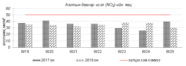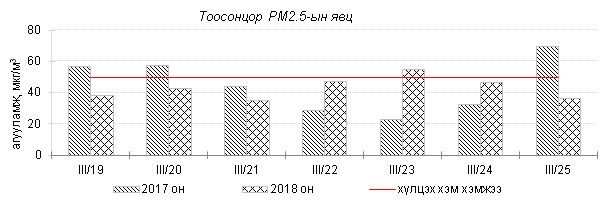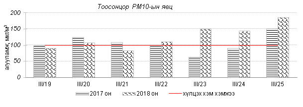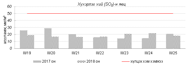 Өнгөрсөн 7 хоногийн агаарын чанарын хяналт шинжилгээний дүнгээр Улаанбаатар хотын агаарын чанар ихэнх өдрүүдэд “Бага” зэргийн бохирдолтой байсан байна. Агаар дахь PM10 тоосонцрын агууламжийг 2017 оны мөн үетэй харьцуулахад 18%-иар их, хүхэрлэг хий, PM2.5 тоосонцрын агууламж 4-5%-иар бага, 24 цагийн дундаж хамгийн их агууламж агаарын чанарын стандартаас 1.8-2.4 дахин их байна. Дэлгэрэнгүй мэдээг хавсралтаас үзнэ үү.