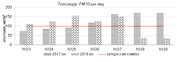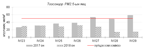 Өнгөрсөн 7 хоногийн агаарын чанарын хяналт шинжилгээний дүнгээр Улаанбаатар хотын агаарын чанар ихэнх өдрүүдэд “Бага” зэргийн бохирдолтой байсан бол 4 дугаар сарын 25-нд тоосонцрын агууламж 2.4 дахин ихэссэн байна. Дэлгэрэнгүйг эндээс үзнэ үү.