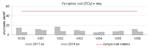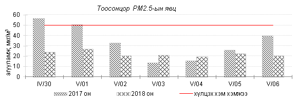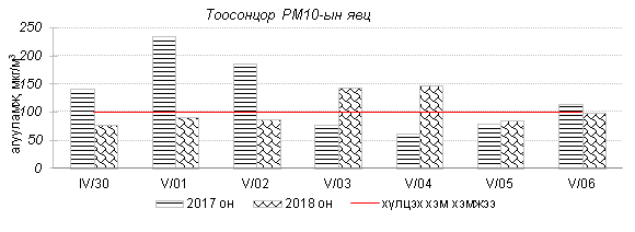 Өнгөрсөн 7 хоногийн агаарын чанарын хяналт шинжилгээний дүнгээр Улаанбаатар хотын агаарын чанар ихэнх өдрүүдэд “Хэвийн” болон “Бага” зэргийн бохирдолтой байсан байна. Агаар дахь PM10 тоосонцрын 7 хоногийн дундаж агууламж 2017 оны мөн үетэй харьцуулахад 18%-иар бага байсан бол 24 цагийн дундаж хамгийн их агууламж агаарын чанарын стандартаас 3.4 дахин их байна.