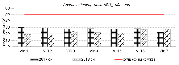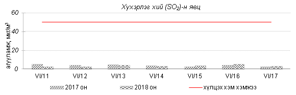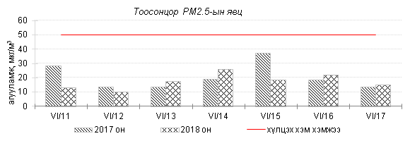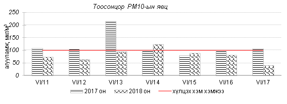 Өнгөрсөн 7 хоногийн агаарын чанарын хяналт шинжилгээний дүнгээр Улаанбаатар хотын төв автозамын дагуу Баруун 4 зам, 13-р хороолол орчим болон бүтээн байгуулалтын ажилтай холбоотойгоор 100 айл, Баянхошуу орчим PM10 тоосонцор, азотын давхар исэл “Бага зэргийн бохирдолтой” түвшинд хүрсэн байна. Хамгийн их бохирдолтой PM10 тоосонцрын 7 хоногийн дундаж агууламжийг өмнөх оны мөн үетэй харьцуулахад 8%-иар бага, 24 цагийн дундаж хамгийн их агууламж агаарын чанарын стандартаас 2.5 дахин их байлаа.