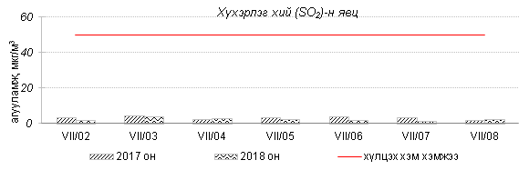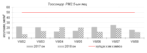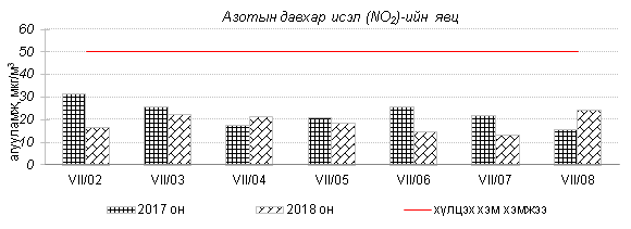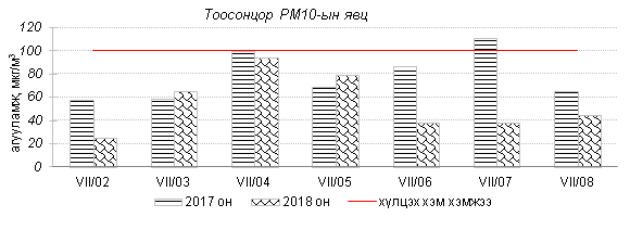 Өнгөрсөн 7 хоногийн агаарын чанарын хяналт шинжилгээний дүнгээр Улаанбаатар хотын төв автозамын дагуу Баруун 4 зам, 13-р хороолол орчим азотын давхар исэл “Бага зэргийн бохирдолтой” түвшинд хүрсэн байна. Хамгийн их бохирдолтой PM10 тоосонцрын 7 хоногийн дундаж агууламжийг өмнөх оны мөн үетэй харьцуулахад 21% хувиар бага түвшинд, харин 24 цагийн дундаж хамгийн их агууламж агаарын чанарын стандартаас 1.7 дахин их байлаа. Дэлгэрэнгүйг эндээс үзнэ үү.