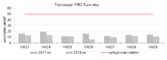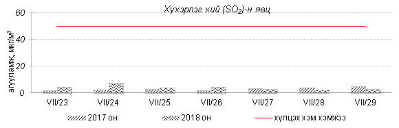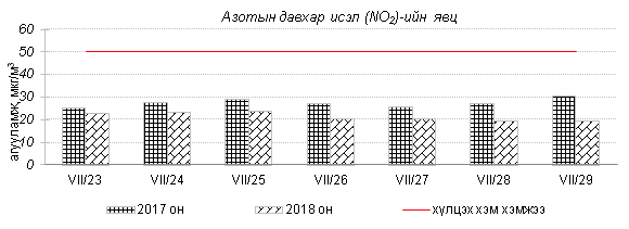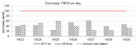 Өнгөрсөн 7 хоногийн агаарын чанарын хяналт шинжилгээний дүнгээр Улаанбаатар хотын агаарын чанар төв автозам дагуух цэгээс бусад цэгүүдэд цэвэр болон хэвийн түвшинд байна. Бага зэргийн их бохирдолтой түвшинд хүрсэн азотын давхар исэл (NO2)-ийн 7 хоногийн дундаж агууламжийг өмнөх оны мөн үетэй харьцуулахад 22%-иар бага, харин 24 цагийн дундаж хамгийн их агууламж Агаарын чанарын стандартаас 1.9 дахин их байлаа. Дэлгэрэнгүйг эндээс үзнэ үү.