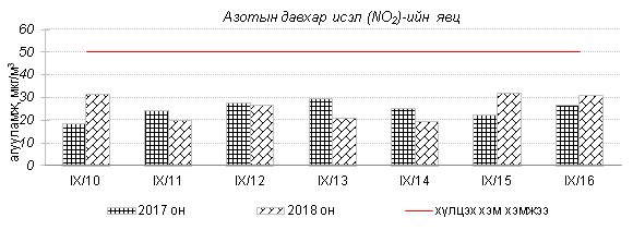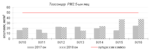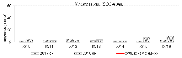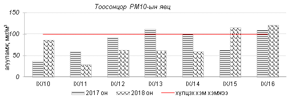 Өнгөрсөн 7 хоногийн агаарын чанарын хяналт шинжилгээний дүнгээр Улаанбаатар хотод агаарын чанар хэвийн болон бага зэргийн бохирдолтой байлаа. Тээврийн хэрэгслээс голчлон ялгардаг азотын давхар исэл (NO2)-ийн 7 хоногийн дундаж агууламжийг өмнөх оны мөн үетэй харьцуулахад ижил түвшинд, 24 цагийн дундаж хамгийн их агууламж Агаарын чанарын стандартаас 2.3 дахин их, харин PM10 тоосонцрын агууламжийг 2017 оны мөн үетэй харьцуулахад 9 хувиар бага. 24 цагийн дундаж хамгийн их агууламж Агаарын чанарын стандартаас 1.8 дахин их байлаа. Дэлгэрэнгүйг эндээс үзнэ үү.