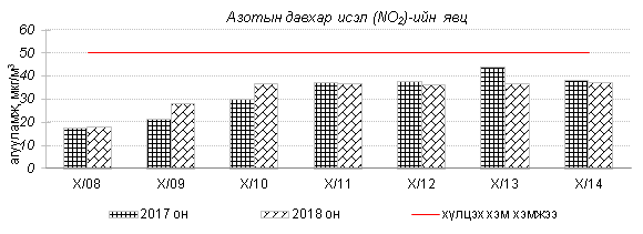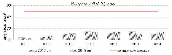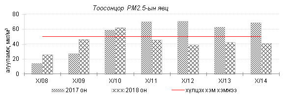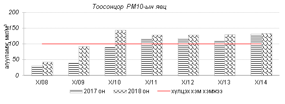 Өнгөрсөн 7 хоногийн агаарын чанарын хяналт шинжилгээний дүнгээр Улаанбаатар хотод 7 хоногийн эхний өдрүүдэд салхины эрчим ихэсч, хуурайшилт ихтэй байсантай холбоотойгоор агаарт тоосонцрын агууламж ихэсч агаарын чанар “Бага зэргийн бохирдол”-той түвшинд хүрсэн байна. Хамгийн их бохирдолтой PM10 тоосонцрын агууламжийг 2017 оны мөн үетэй харьцуулахад 20 %-аар их, 24 цагийн дундаж хамгийн их агууламж Агаарын чанарын стандартаас 2.1 дахин их байлаа.