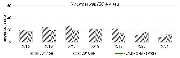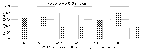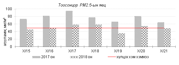 Өнгөрсөн 7 хоногийн агаарын чанарын хяналт шинжилгээний дүнгээр Улаанбаатар хотын хэмжээнд агаарын чанар “Бага бохирдолтой” байсан байна. Хамгийн их бохирдолтой PM10 тоосонцрын агууламжийг 2017 оны мөн үетэй харьцуулахад 14%-аар их, 24 цагийн дундаж хамгийн их агууламж Агаарын чанарын стандартаас 2.9 дахин их байлаа. Дэлгэрэнгүйг эндээс үзнэ үү.