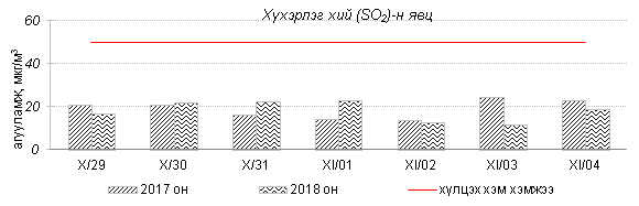 Өнгөрсөн 7 хоногийн агаарын чанарын хяналт шинжилгээний дүнгээр Улаанбаатар хотын хэмжээнд агаарын чанар “Бага бохирдолтой” байсан байна. Хамгийн их бохирдол илэрсэн PM10 тоосонцрын агууламжийг 2017 оны мөн үетэй харьцуулахад 24%-иар бага, 24 цагийн дундаж хамгийн их агууламж Агаарын чанарын стандартаас 2.5  дахин их байлаа. Дэлэгрэнгүйг хавсралтаас үзнэ үү.