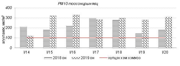 Өнгөрсөн 7 хоногийн агаарын чанарын хяналт шинжилгээний дүнгээр Улаанбаатар хотын гэр хороолол орчимд бусад цэгээс хамгийн их бохирдол илэрч агаарын чанарын индексээр “Их бохирдолтой”, “Маш их бохирдолтой” түвшинд хүрсэн байна. Агаарт PM2.5, PM10 тоосонцрын агууламж хамгийн их байсан бөгөөд эдгээр тоосонцрын 24 цагийн дундаж хамгийн их агууламж Агаарын чанарын стандартаас 7-12 дахин их байлаа. Дэлгэрэнгүйг эндээс үзнэ үү.