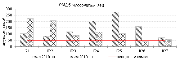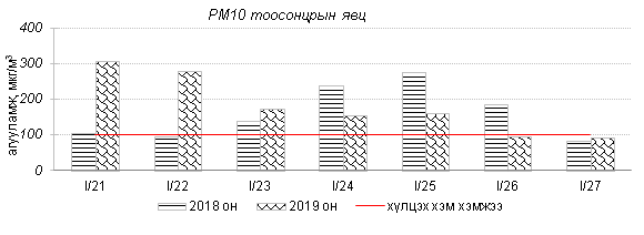 Улаанбаатар хотын агаарын чанарын хяналт шинжилгээний дүнгээр өнгөрсөн 7 хоногийн эхний өдрүүдэд агаарын чанарын индексээр “Их бохирдолтой”, “Маш их бохирдолтой” түвшинд хүрсэн байна. Агаарт PM2.5, PM10 тоосонцрын агууламж хамгийн их байсан бөгөөд эдгээр тоосонцрын 24 цагийн дундаж хамгийн их агууламж Агаарын чанарын стандартаас 5-8 дахин их байлаа. Дэлгэрэнгүйг эндээс үзнэ үү.