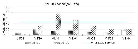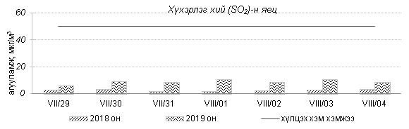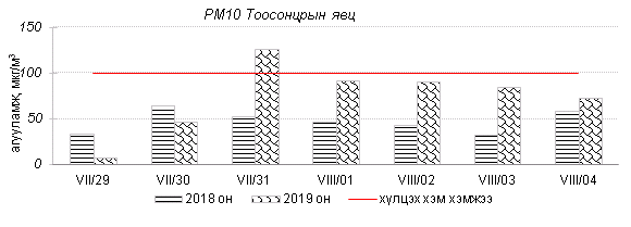 Өнгөрсөн 7 хоногийн агаарын чанарын хяналт шинжилгээний дүнгээр Улаанбаатар хотын агаарын чанар “Цэвэр” болон “Хэвийн” түвшнээс 7 хоногийн дунд үеэс эхлэн ихэнх хяналтын цэгүүдэд “Бага бохирдолтой” түвшинд хүрсэн байна. ОХУ-д гарсан ойн түймрийн утаа агаарын урсгалын дагуу Сэлэнгэ, Орхон, Дархан-Уул аймгийн нутаг дэвсгэрээр илүү ажиглагдан шилжин ирсэн ба түймрийн утаанаас үүсэлтэй РМ10, РМ2.5 тоосонцор, нүүрстөрөгчийн дутуу ислийн агууламж өмнөх 7 хоногийн дундажаас 1.8-2.7 дахин их байна. Дэлгэрэнгүйг эндээс үзнэ үү.