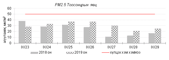 Өнгөрсөн 7 хоногийн агаарын чанарын хяналт шинжилгээний дүнгээр Улаанбаатар хотын агаарын чанар ихэнхдээ “Бага бохирдолтой” түвшинд байсан байна. Шөнөдөө агаарын температур буурч байгаатай холбоотойгоор галлагаа эхэлж, гэр хороолол орчим РМ10 тоосонцрын агууламж нэмэгдсэн ба зарим өдөр Нисэх, Баянхошуу орчим “Бохирдолтой” түвшинд хүрсэн тохиолдол ажиглагдсан. Дэлгэрэнгүйг эндээс үзнэ үү.