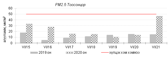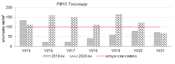 Улаанбаатар хотын агаарт түгээмэл бохирдуулах бодис хүхэрлэг хий /SO2/, азотын давхар исэл /NO2/, тоосонцор /PM10, PM2.5/, нүүрстөрөгчийн дутуу исэл /CO/, озон /O3/-ны агууламжийг тодорхойллоо.
