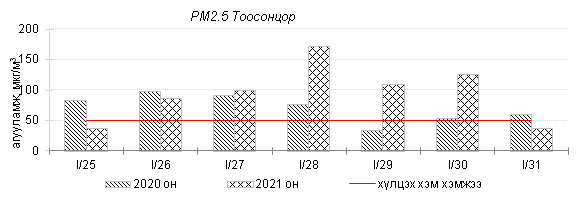 Улаанбаатар хотын агаарт түгээмэл бохирдуулах бодис хүхэрлэг хий /SO2/, азотын давхар исэл /NO2/, тоосонцор /PM10, PM2.5/, нүүрстөрөгчийн дутуу исэл /CO/, озон /O3/-ы агууламжийг тодорхойллоо.