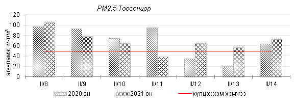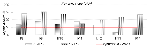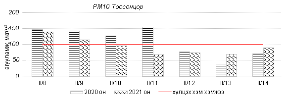 Улаанбаатар хотын агаарт түгээмэл бохирдуулах бодис хүхэрлэг хий /SO2/, азотын давхар исэл /NO2/, тоосонцор /PM10, PM2.5/, нүүрстөрөгчийн дутуу исэл /CO/, озон /O3/-ы агууламжийг тодорхойллоо.